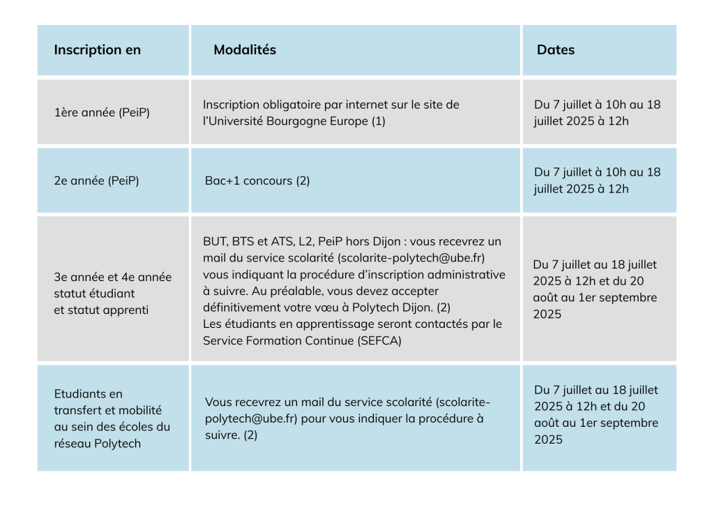 Etudiants admis à titre individuel s’adresser à la scolarité de Polytech Dijon (polytech-scolarite@ube.fr)